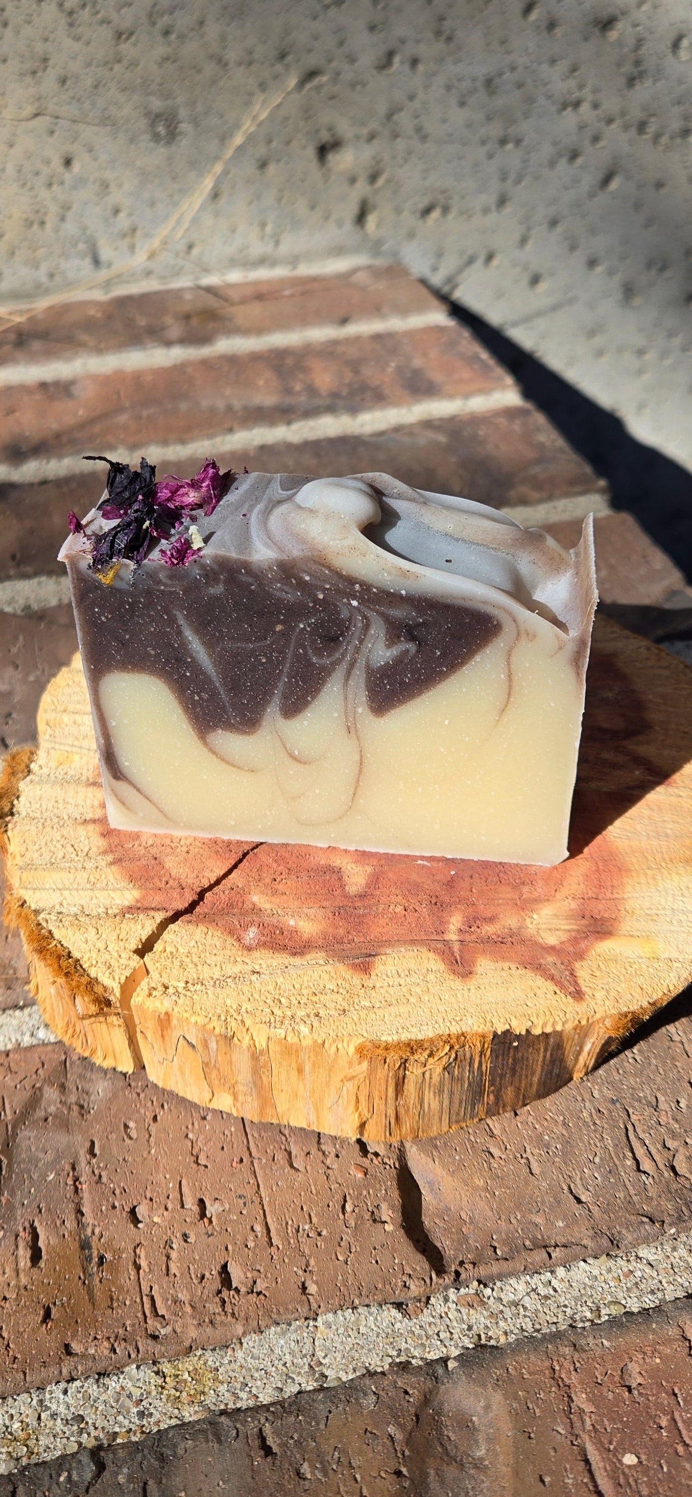 Ingredients: Extra virgin olive oil, grass-fed beef tallow, coconut oil, organic castor oil, organic sweet almond oil, raw shea butter, sodium hydroxide (lye), distilled water, alkanet root powder, organic kaolin clay, lavender essential oil, and dried violet botanicals.